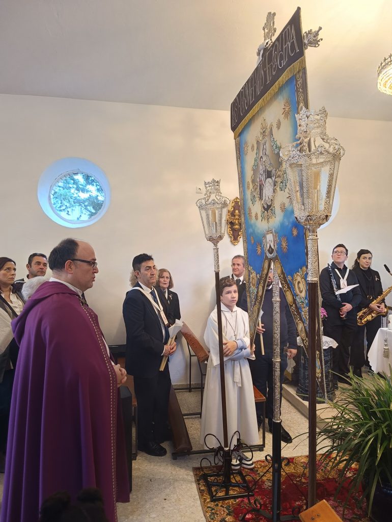 Un momento destacado dentro del mismo acto fue el estreno de dos composiciones musicales: “Ánimas Benditas”, obra de nuestro hermano Juan Palacios Higueras, y “Rezo en la Penumbra”, compuesta por Carlos Llano Picón. Ambas piezas fueron interpretadas por el Trío de Capilla que acompañaba musicalmente el rezo del Santo Rosario, aportando una nueva dimensión a este acto solemne y elevando aún más el ambiente de espiritualidad que marcó la ocasión.