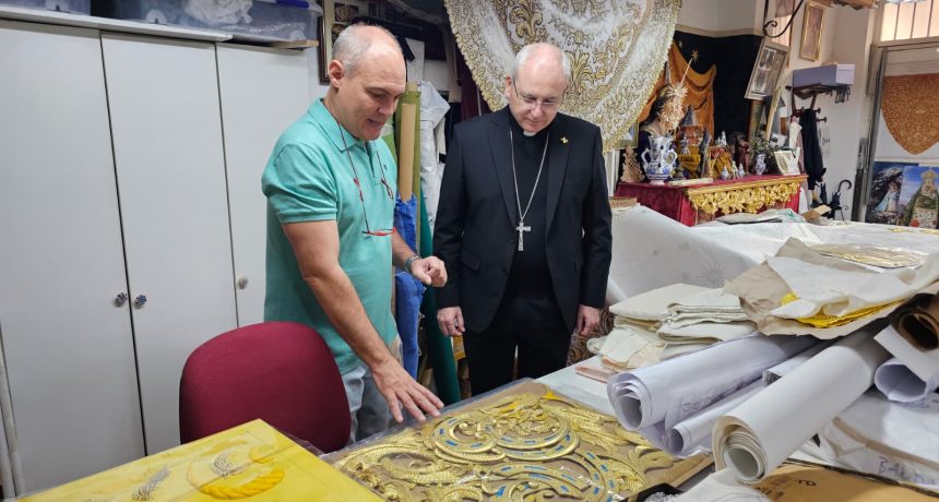 Posteriormente se ha trasladado al taller de bordado de Pedro Palenciano Olivares, reconocido artesano del bordado en oro. Allí ha podido piezas en ejecución destinadas a hermandades de Huelva y Jaén y observar la meticulosa labor que se mantiene con las mismas técnicas y materiales desde la Edad Media. También ha apreciado la faceta de proyectista de este artesano, que realiza diseños de enseres procesionales para toda Andalucía.
