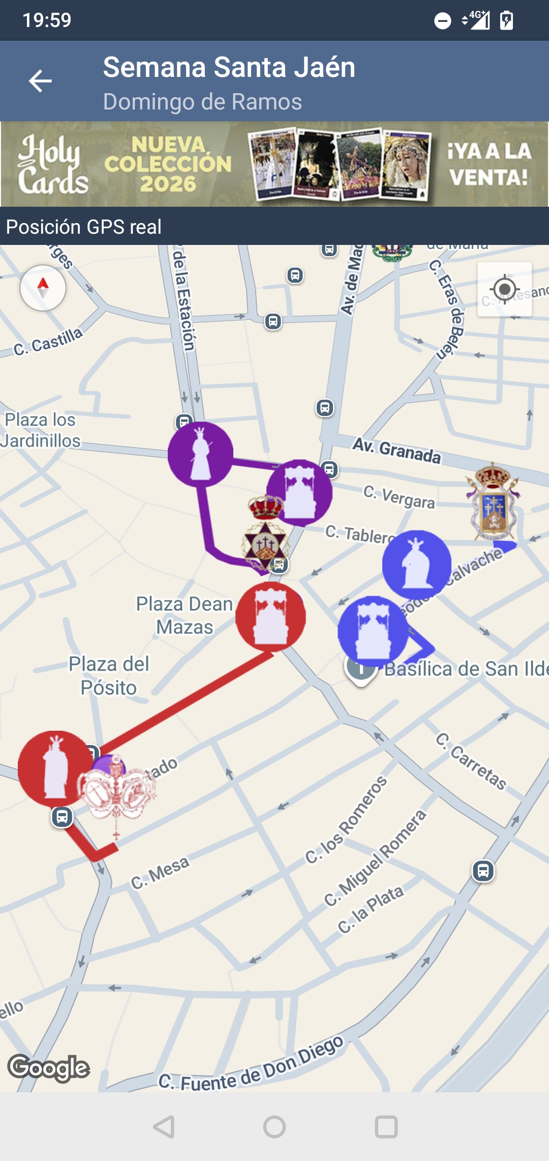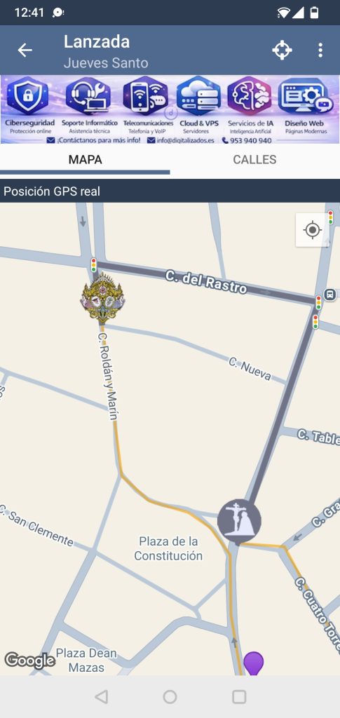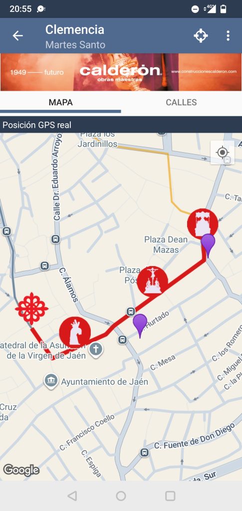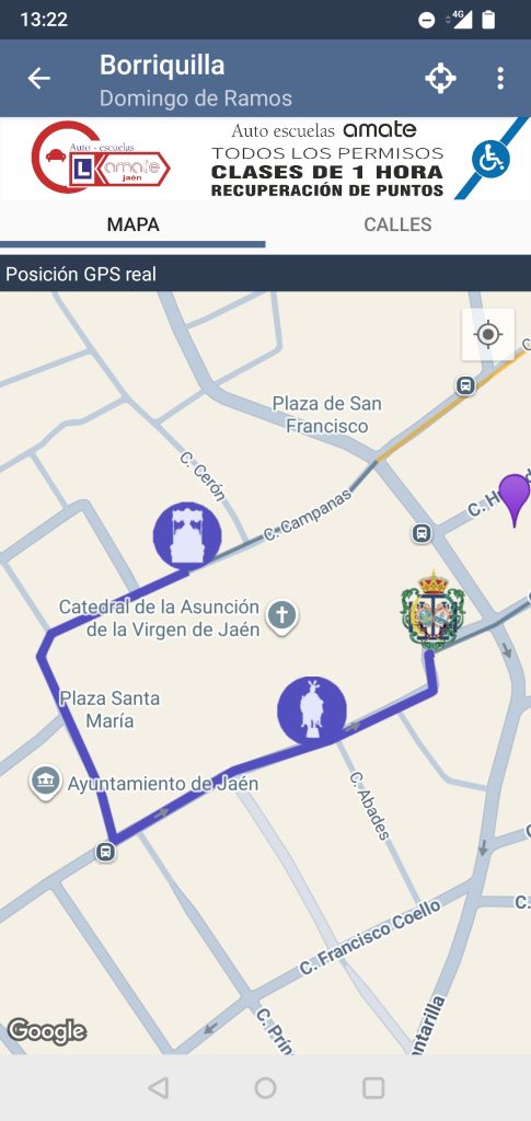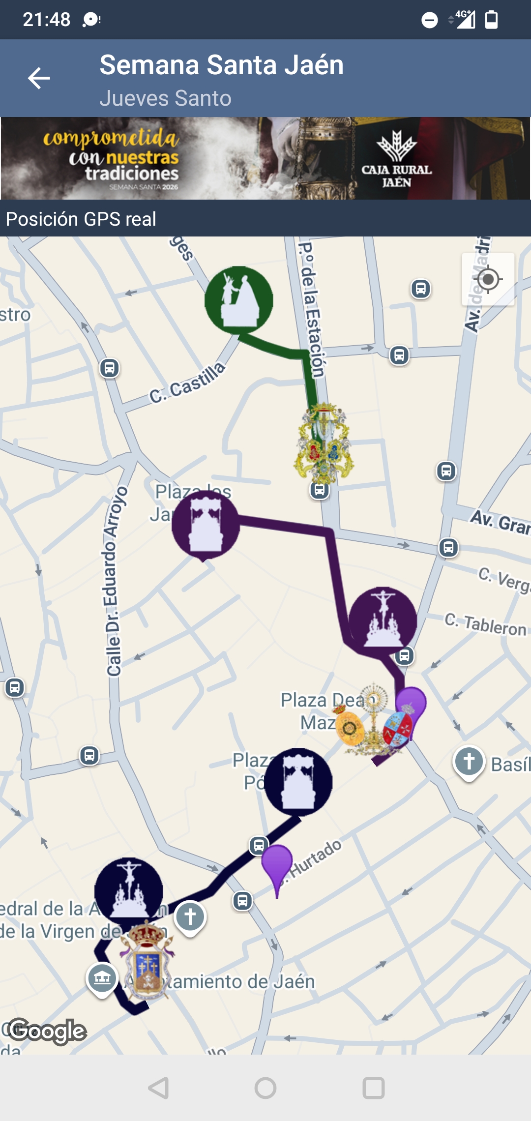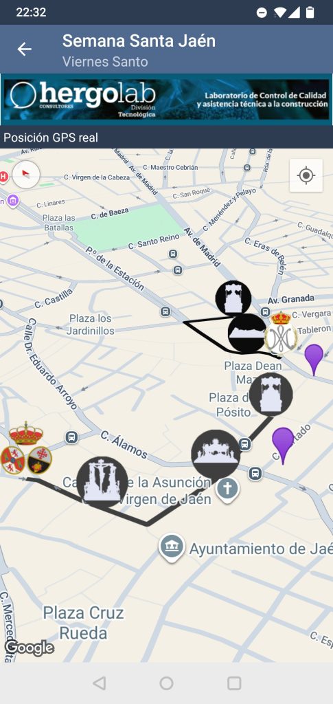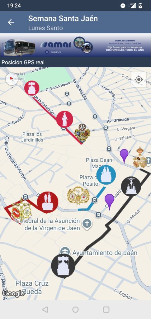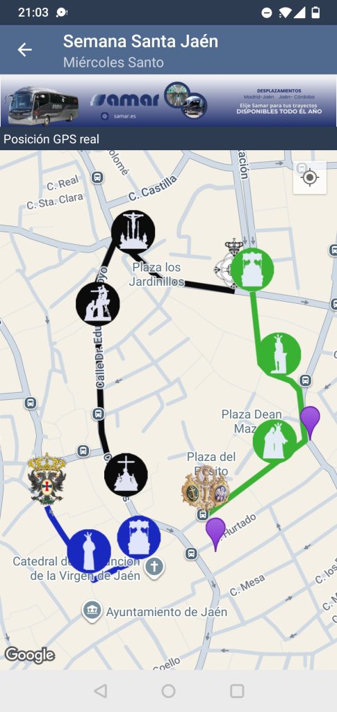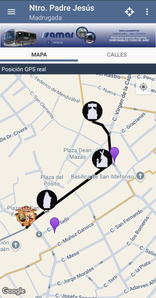 Pasión en Jaén para móvil es la única aplicación que ofrece la posición geolocalizada en tiempo real de cada una de las cofradías y hermandades que procesionan por nuestra ciudad durante Semana Santa. Esto se consigue gracias a los dispositivos de posicionamiento GPS que Pasión en Jaén sufraga e instala en la cabecera y en en cada uno de los pasos que forman parte de cada cortejo procesional, lo que permite al usuario ver la longitud real de la cofradía en las calles.