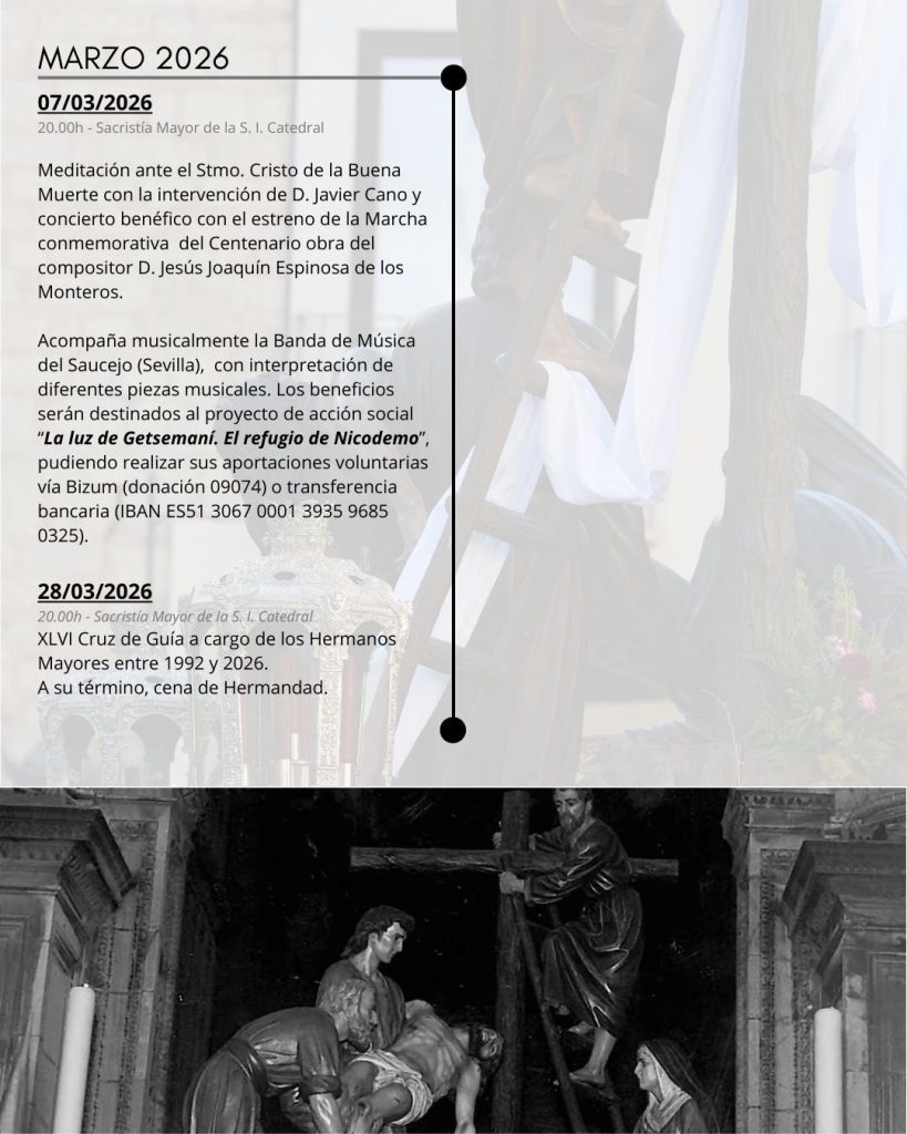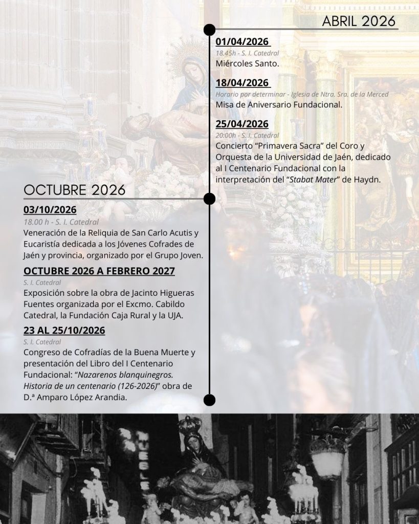 Ya en el mes de marzo escucharemos la marcha compuesta por Jesús Joaquín Espinosa de los Monteros con motivo de esta efeméride y para el mes de octubre se prevé la organización del Congreso de Cofradías de la Buena Muerte en cuyo marco se presentará el libro “Nazarenos blanquinegros. Historia de un centenario”, de Amparo López Arandia.