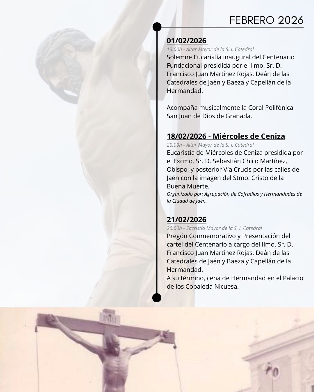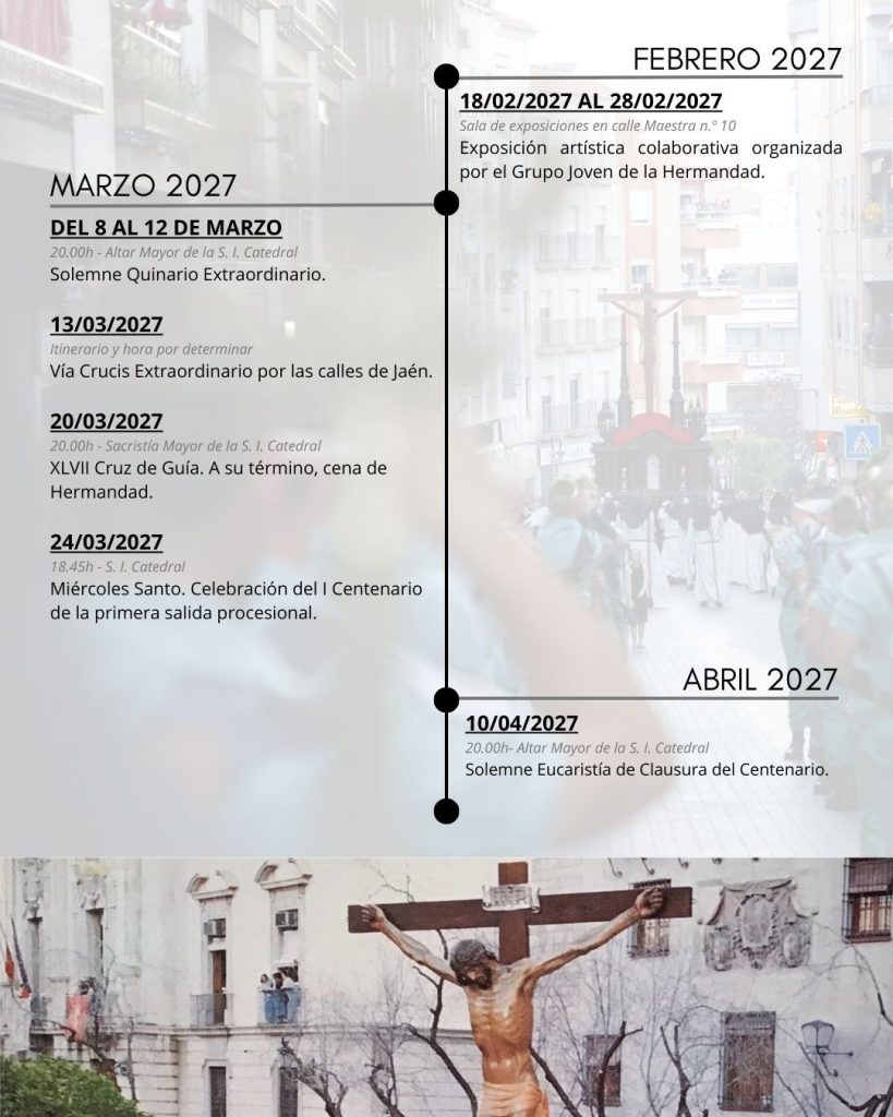 En la programación de este centenario destacan varias citas. La primera será este Miércoles de Ceniza, cuando el Cristo de la Buena Muerte protagonice el Vía Crucis de las hermandades. El 21 de febrero se celebrará un pregón conmemorativo a cargo del deán de la Catedral, D. Francisco Juan Martínez Rojas y se presentará el cartel de este centenario.