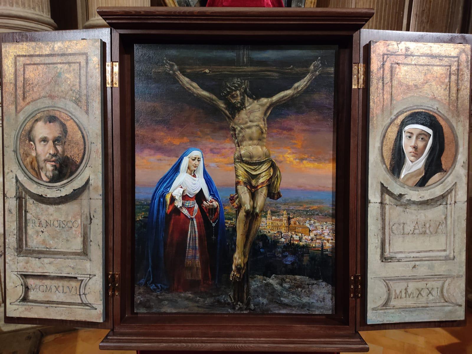 Una familia de cofrades y artistas firma el tríptico con el que la Hermandad de los Estudiantes conmemora su 75º aniversario fundacional. Francisco Carrillo Cruz, Francisco Carrillo Rodríguez y Alberto Carrillo Rodríguez han realizado la original obra que ha sido presentada por el deán de la Catedral de Jaén y Vicario General de la Diócesis, Francisco Juan Martínez Rojas.
