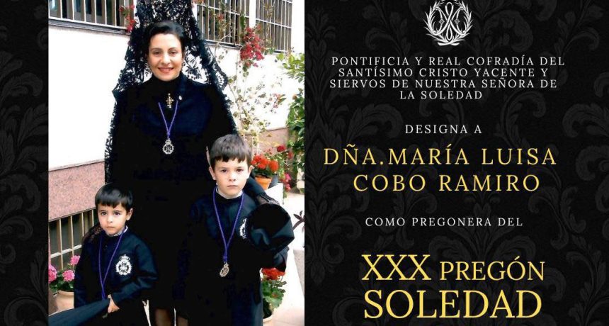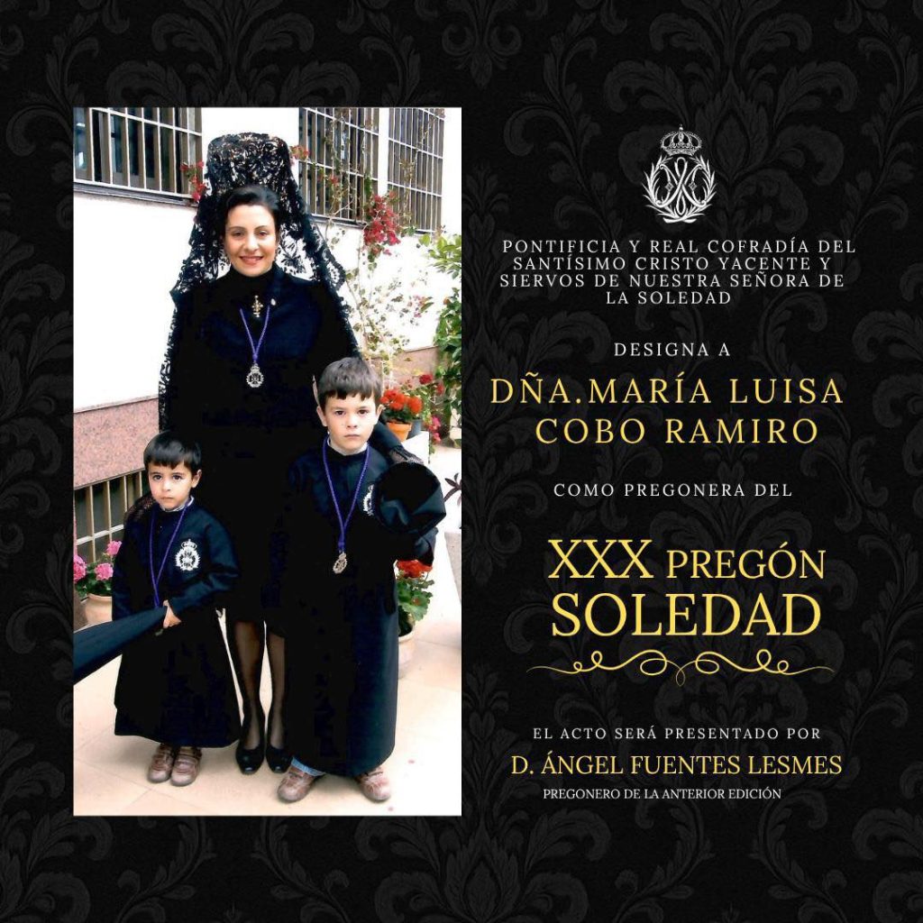 La Pontificia y Real Cofradía del Santísimo Cristo Yacente y Siervos de Nuestra Señora de la Soledad ha anunciado que el XXX Pregón Soledad será pronunciado por María Luisa Cobo Ramiro. Perteneciente al cuerpo de mantillas desde el año 2002, en 2006 se incorporó oficialmente como cofrade junto a su hijo pequeño, afianzando así su profundo vínculo con Nuestra Señora de la Soledad. Desempeñó el cargo de Secretaria en la Junta de Gobierno durante los años 2011 y 2012.
