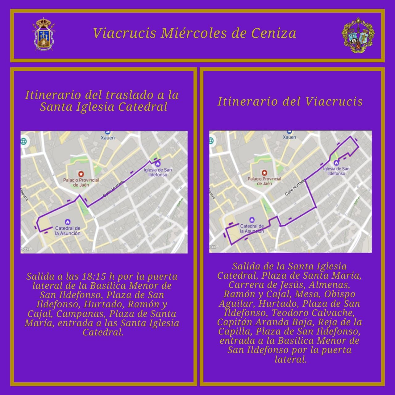 Una vez finalizada la Eucaristía e imposición de la ceniza en la seo jiennense, que dará comienzo a las 20 horas, se organizará el Vía Crucis de regreso a San Ildefonso en el que participarán los grupos jóvenes de las hermandades de Jaén con la lectura de los misterios. El itinerario de regreso será Plaza Santa María, Carrera de Jesús, Almenas, Ramón y Cajal, Mesa, Obispo Aguilar, Hurtado, Plaza de San Ildefonso, Teodoro Calvache, Capitán Aranda Baja, Reja de la Capilla, Plaza de San Ildefonso y entrada a la Basílica de San Ildefonso.