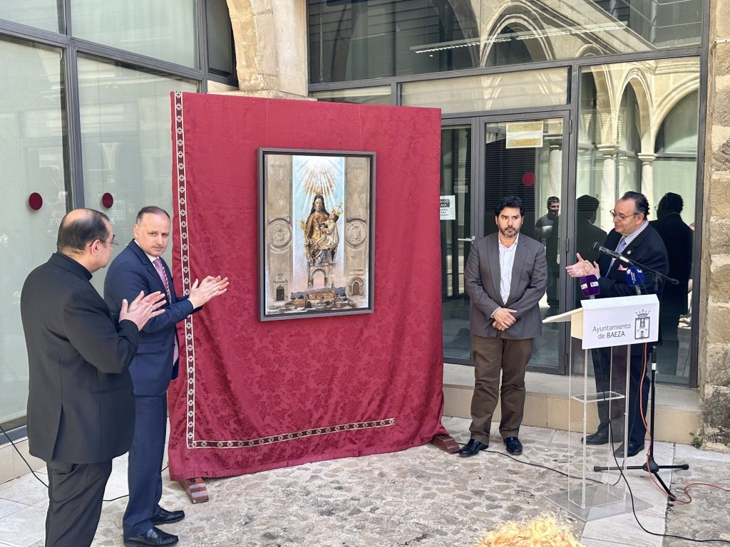 Respecto a la obra pictórica, que era presentada el pasado sábado, la misma representa a la imagen de la Virgen del Alcázar, Excelsa Patrona de Baeza, siendo coronada bajo la luz del Espíritu Santo.