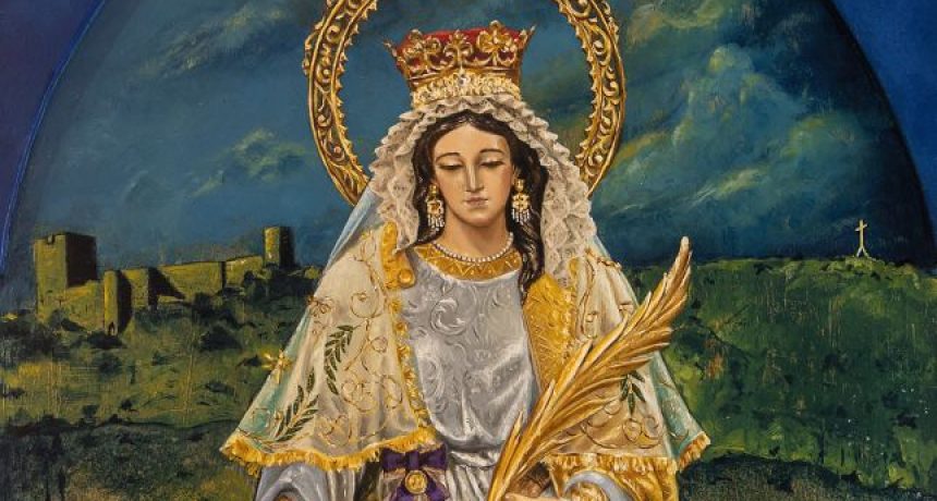 En el centro, Santa Catalina aparece vestida de princesa, evocando su imagen procesional, con la medalla de Jaén en su cintura y portando sus atributos tradicionales: la rueda y la espada del martirio (símbolos de su fortaleza y fe) y la palma (símbolo de la victoria, el triunfo sobre la muerte y la fidelidad inquebrantable a la fe cristiana). Tras ella se alza majestuoso el castillo de Santa Catalina, dominando la ciudad de Jaén. Ese castillo, fondo del cartel, se convierte en símbolo de nuestra propia cima sagrada, como si en Jaén tuviésemos nuestro propio Sinaí.