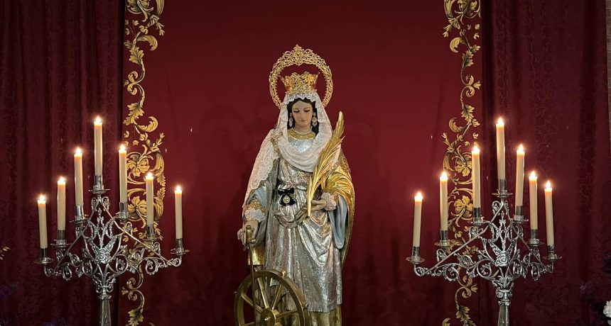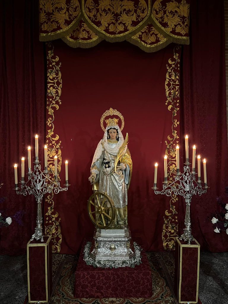 La imagen de Santa Catalina ha sido retirada del culto para proceder a su restauración. La Cofradía ha celebrado una Eucaristía de despedida en la Parroquia de la Inmaculada y San Pedro Pascual antes de su marcha a tierras sevillanas donde permanecerá hasta el próximo mes de septiembre.