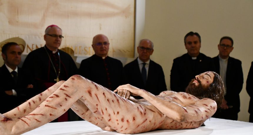 Llegado el momento de más emoción, las autoridades y los miembros del Consejo de Gobierno y del Cabildo han pasado a la sala que alberga la imagen hiperrealista del hombre de la Sábana Santa. De manera ceremoniosa, han levantado el lienzo que cubría el cuerpo, para después tener un momento de profundidad ante el misterio de la Encarnación: Dios mismo, entra a formar parte de la historia de la humanidad, para muriendo y resucitando, devolvernos la dignidad de hijos de Dios.