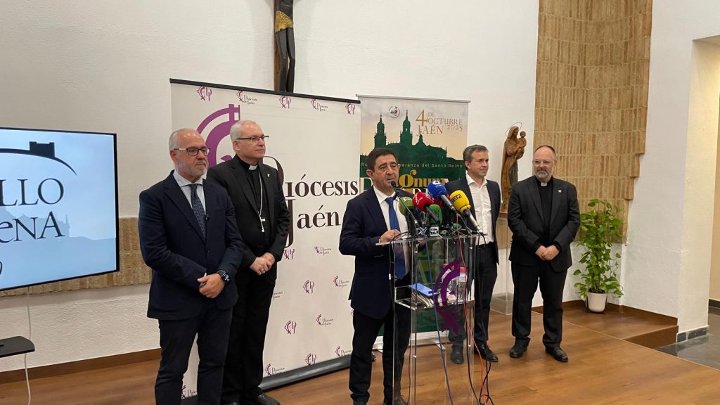 El delegado de la Junta de Andalucía en Jaén, D. Jesús Estrella, ha comenzado su intervención felicitando al Obispado por esta iniciativa. Hemos de felicitar al Obispado por haber sabido concitar la suma de voluntades para que este evento singular, cultural, que entronca con nuestra esencia en la historia, en la tradición y en la fe, cuente con la complicidad de todas las administraciones y de toda la sociedad jiennense”. A continuación, el delegado del Gobierno andaluz ha repasado el dispositivo que se ha puesto en marcha para cubrir el evento, que va desde el refuerzo en la sala de coordinación de Emergencias 112; una red de comunicaciones alternativa “para que, en caso de que se produzca cualquier eventualidad, se cuente con una red de comunicación permanentemente garantizada”. O, la Unidad de Policía Adscrita a la Comunidad Autónoma de Andalucía se integrará en las labores que lleven a cabo desde el Cuerpo de Policía Nacional. Paralelamente, efectivos de Policía Adscrita y del 112 participarán del centro de coordinación que se va a articular por parte del Ayuntamiento de la capital. Así como el patrocinio económico, que  “refuerza el actual y viene a garantizar cualquier tipo de intervención ante cualquier eventualidad”.